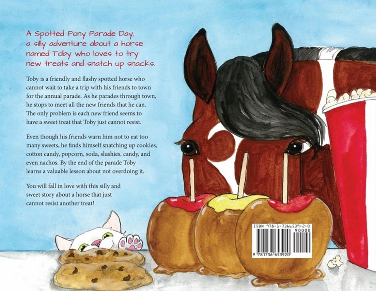 A Spotted Pony Parade Day is a beautifully illustrated adventure inspired by events of a real horse named Toby. Toby is a friendly and flashy spotted horse who loves to snatch up snacks and try new treats. The annual parade is coming to town and he cannot wait to join his friends on an adventure. Toby is so busy watching everyone get ready to high step through town that he forgets to eat a healthy breakfast. He soon realizes he is a very hungry horse. There are many new friends to meet in town and Toby wants to stop and greet them all. The problem is each new friend has a sweet treat and Toby finds them very hard to resist. Even though his friends warn him not to eat too many sweets, he finds himself snatching up all those cookies, candies, popcorn, and even nachos! Follow Toby on his exciting (and filling) journey through town as he nibbles all the treats he can. By the end of the parade Toby learns a valuable lesson about not overdoing it. You will fall in love with this silly story about a horse that just cannot resist another sweet treat!