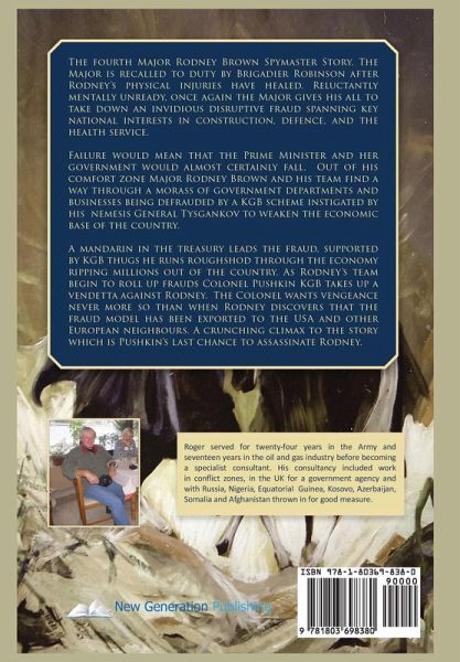 The fourth Major Rodney Brown Spymaster Story. The Major is recalled to duty by Brigadier Robinson after Rodney's physical injuries have healed. Reluctantly mentally unready, once again the Major gives his all to take down an invidious disruptive fraud spanning key national interests in construction, defence, and the health service. Failure would mean that the Prime Minister and her government would almost certainly fall. Out of his comfort zone Major Rodney Brown and his team find a way through a morass of government departments and businesses being defrauded by a KGB scheme instigated by his nemesis General Tysgankov to weaken the economic base of the country. A mandarin in the treasury leads the fraud, supported by KGB thugs he runs roughshod though the economy ripping millions out of the country. As Rodney's team begin to roll the frauds Colonel Pushkin KGB takes up a vendetta against Rodney. The Colonel wants vengeance never more so when Rodney discovers that the fraud model has been exported to the USA and other European neighbours. A crunching climax to the story which is Pushkin's last chance to assassinate Rodney.