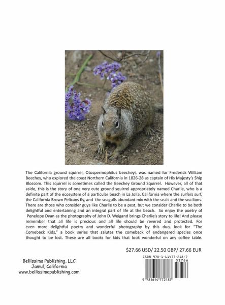 The California ground squirrel, Otospermophilus beecheyi, was named for Frederick William Beechey, who explored the coast Northern California in 1826-28 as captain of His Majesty's Ship Blossom. This squirrel is sometimes called the Beechey Ground Squirrel. However, all of that aside, this is the story of one very cute ground squirrel appropriately named Charlie, who is a definite part of the ecosystem of a particular beach in La Jolla, California where the surfers surf, the California Brown Pelicans fly, and the seagulls abundant mix with the seals and the sea lions. There are those who consider guys like Charlie to be a pest, but we consider Charlie to be both delightful and entertaining and an integral part of life at the beach. So enjoy the poetry of Penelope Dyan as the photography of John D. Weigand brings Charlie's story to life! And please remember that all life is precious and all life should be revered and protected. For even more delightful poetry and wonderful photography by this duo, look for "The Comeback Kids," a book series that salutes the comeback of endangered species once thought to be lost. These are all books for kids that look wonderful on any coffee table.