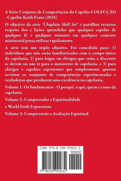 A Série Conjunto de Competências do Capelão COLECÇÃO - Capelão Keith Evans (2025) O objetivo da série "Chaplain Skill Set" é partilhar recursos respeita dos e lições aprendidas que qualquer capelão de qualquer fé e qualquer ministro em qualquer contexto ministerial possa utilizar rapidamente. A série tem um triplo objetivo. Foi concebida para: 1) indivíduos que não estão familiarizados com o campo único da capelania, 2) para leigos ou clérigos que estão a discernir se devem ou não ir para o ministério de capelania, e 3) para clérigos e capelães experientes que simplesmente querem revisitar os conjuntos de competências experimentadas e verdadeiras que produzem uma excelência na capelania. Volume 1: Os fundamentos O porquê, o quê, quem e como da capelania Volume 2: Compreender a Espiritualidade e World Faith Expressions Volume 3: Compreensão a Avaliação Espiritual