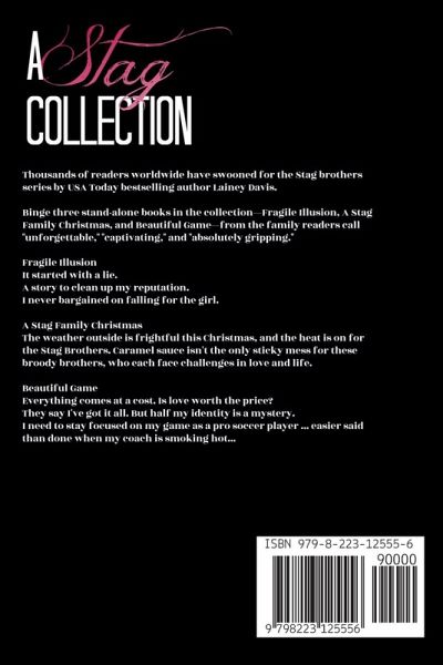 Thousands of readers worldwide have swooned for the Stag brothers series by USA Today bestselling author Lainey Davis. Binge three stand-alone books in the collection-Fragile Illusion, A Stag Family Christmas, and Beautiful Game-from the family readers call "unforgettable," "captivating," and "absolutely gripping." Fragile Illusion It started with a lie. A story to clean up my reputation. I never bargained on falling for the girl. A Stag Family Christmas The weather outside is frightful this Christmas, and the heat is on for the Stag Brothers. Caramel sauce isn't the only sticky mess for these broody brothers, who each face challenges in love and life. Beautiful Game Everything comes at a cost. Is love worth the price? They say I've got it all. But half my identity is a mystery. I need to stay focused on my game as a pro soccer player … easier said than done when my coach is smoking hot… What Readers Are Saying "My commute just got ten times hotter." Mandy, Goodreads "A fabulous fake relationship type romance. The chemistry between the two characters is sizzling hot and I loved how it all plays out. "- Bette, Amazon Vine(TM) Review "WOW!!!! What else is there to say? This was a really HOT story, and you will be missing out if you don't read it. I couldn't put it down it was that good!" - Kathleen, Goodreads