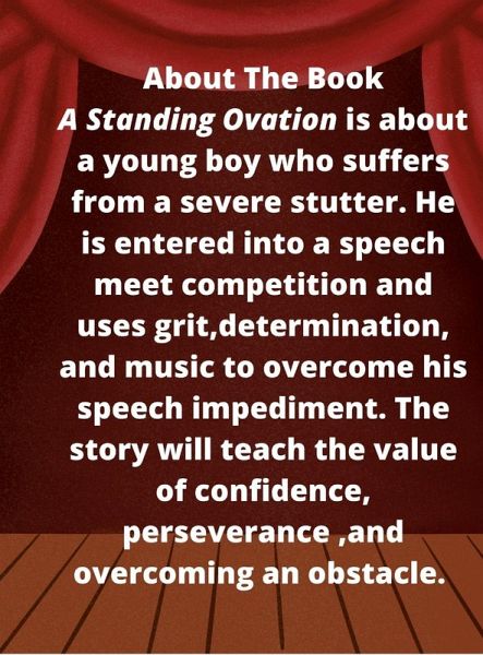 A Standing Ovation is about a young boy who suffers from a severe stutter. He is entered into a speech meet competition and uses grit,determination, and music to overcome his speech issue. The story will teach the value of confidence, perseverance ,and overcoming an obstacle.