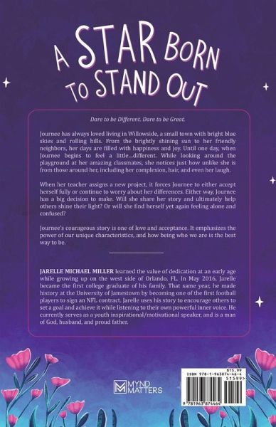 Dare to be Different. Dare to be Great.Journee has always loved living in Willowside, a small town with bright blue skies and rolling hills. From the brightly shining sun to her friendly neighbors, her days are filled with happiness and joy. Until one day, when Journee begins to feel a little...different. While looking around the playground at her amazing classmates, she notices just how unlike she is from those around her, including her complexion, hair, and even her laugh. When her teacher assigns a new project, it forces Journee to either accept herself fully or continue to worry about her differences. Either way, Journee has a big decision to make. Will she share her story and ultimately help others shine their light? Or will she find herself yet again feeling alone and confused? Journee's courageous story is one of love and acceptance. It emphasizes the power of our unique characteristics, and how being who we are is the best way to be.
