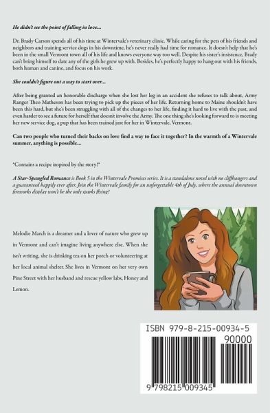 He didn't see the point of falling in love... Dr. Brady Carson spends all of his time at Wintervale's veterinary clinic. While caring for the pets of his friends and neighbors and training service dogs in his downtime, he's never really had time for romance. It doesn't help that he's been in the small Vermont town all of his life and knows everyone way too well. Despite his sister's insistence, Brady can't bring himself to date any of the girls he grew up with. Besides, he's perfectly happy to hang out with his friends, both human and canine, and focus on his work. She couldn't figure out a way to start over... After being granted an honorable discharge when she lost her leg in an accident she refuses to talk about, Army Ranger Theo Matheson has been trying to pick up the pieces of her life. Returning home to Maine shouldn't have been this hard, but she's been struggling with all of the changes to her life, finding it hard to live with the past, and even harder to see a future for herself that doesn't involve the Army. The one thing she's looking forward to is meeting her new service dog, a pup that has been trained just for her in Wintervale, Vermont. Can two people who turned their backs on love find a way to face it together? In the warmth of a Wintervale summer, anything is possible... *Contains a recipe inspired by the story!* A Star-Spangled Romance is Book 5 in the Wintervale Promises series. It is a standalone novel with no cliffhangers and a guaranteed happily ever after. Join the Wintervale family for an unforgettable 4th of July, where the annual downtown fireworks display won't be the only sparks flying!