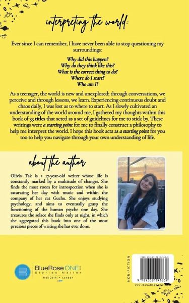 Ever since I can remember, I have never been able to stop questioning my surroundings: Why did this happen? Why do they think like this? What is the correct thing to do? Where do I start? Who am I? As a teenager, the world is new and unexplored; through conversations, we perceive and through lessons, we learn. Experiencing continuous doubt and chaos daily, I was lost as to where to start. As I slowly cultivated an understanding of the world around me, I gathered my thoughts within this book of 33 titles that acted as a set of guidelines for me to stick by. These writings were 'a starting point' for me to finally construct a philosophy to help me interpret the world. I hope this book acts as 'a starting point' for you too to help you navigate through your own understanding of life.