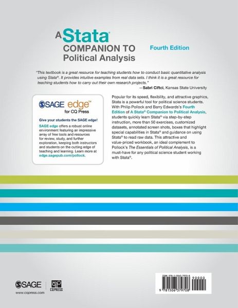 Popular for its speed, flexibility, and attractive graphics, Stata is a powerful tool for political science students. With Philip Pollock's Fourth Edition of A Stata® Companion to Political Analysis, students quickly learn Stata via step-by-step instruction, more than 50 exercises, customized datasets, annotated screen shots, boxes that highlight Stata's special capabilities, and guidance on using Stata to read raw data. This attractive and value-priced workbook, an ideal complement to Pollock's Essentials of Political Analysis, is a must-have for any political science student working with Stata.