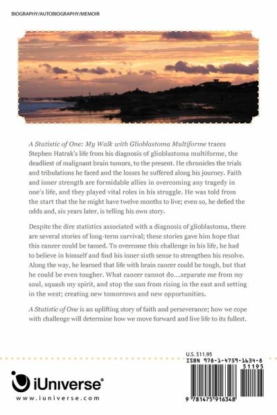 A Statistic of One: My Walk with Glioblastoma Multiforme traces Stephen Hatrak's life from his diagnosis of glioblastoma multiforme, the deadliest of malignant brain tumors, to the present. He chronicles the trials and tribulations he faced and the losses he suffered along his journey. Faith and inner strength are formidable allies in overcoming any tragedy in one's life, and they played vital roles in his struggle. He was told from the start that the he might have twelve months to live; even so, he defi ed the odds and, six years later, is telling his own story. Despite the dire statistics associated with a diagnosis of glioblastoma, there are several stories of long-term survival; these stories gave him hope that this cancer could be tamed. To overcome this challenge in his life, he had to believe in himself and fi nd his inner sixth sense to strengthen his resolve. Along the way, he learned that life with brain cancer could be tough, but that he could be even tougher. What cancer cannot do....separate me from my soul, squash my spirit, and stop the sun from rising in the east and setting in the west; creating new tomorrows and new opportunities. A Statistic of One is an uplifting story of faith and perseverance; how we cope with challenge will determine how we move forward and live life to its fullest.