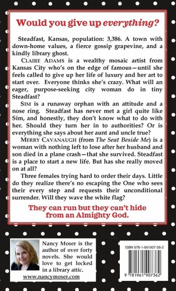 Would you give up everything to follow Jesus? Welcome to Steadfast, Kansas. Population: 3,386. A town with down-home values, a fierce gossip grapevine, and a kindly library ghost. Claire Adams is a wealthy mosaic artist from Kansas City who's on the edge of famous-until she feels called to abandon her life of luxury and her art to start over. Everyone thinks she's crazy. What will an eager, purpose-seeking city woman do in tiny Steadfast? Sim is a runaway orphan with an attitude and a nose ring. Steadfast has never met a girl quite like Sim, and honestly, they don't know what to do with her. Should they turn her in to authorities? Or is everything she says about her aunt and uncle true? Merry Cavanaugh (from The Seat Beside Me) is a woman with nothing left to lose after her husband and son died in a plane crash-that she survived. Steadfast is a place to start a new life. But has she really moved on at all? Three females trying hard to order their days. Little do they realize there's no escaping the One who sees their every step and asks for their unconditional surrender. Will they wave the white flag? They can run but they can't hide from an Almighty God