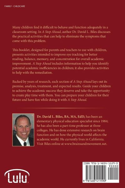 Many children find it difficult to behave and function adequately in a classroom setting. In A Step Ahead, author Dr. David L. Biles discusses the practical activities that can help to eliminate the symptoms that come with this problem. This booklet, designed for parents and teachers to use with children, presents activities intended to improve eye tracking for better reading, balance, memory, and concentration for overall academic improvement. A Step Ahead includes information to help you identify potential academic inefficiencies in children; it also provides activities to help with the remediation. Backed by years of research, each section of A Step Ahead lays out its premise, analysis, treatment, and expected results. Guide your children to achieve the academic success they deserve and take the opportunity to create play time with them. You can prepare your children for their future and have fun while doing it with A Step Ahead.