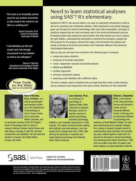 Norm O' Rourke,?Ph.D., R. Psych., is a clinical psychologist and assistant professor in the Department of Geontology at Simon Fraser University in Vancouver, Bristish Columbia, and an associate member of the SFU Department of Psychology. Dr. O'Rourke's areas of research interest include mental illness and well-being, marriage in later life, and test construction and validation. He has lived and worked in Canada, the United States, Europe, and Israel. Larry Hatcher, Ph.D., is a professor of psychology at Saginaw Valley State University in Saginaw, Michigan, where he teaches courses in general psychology, industrial psychology, statistics, and computer applications in data analysis. The author of several books dealing with statistics and data analysis, Dr. Hatcher has taught at the college level since 1984, after earning his doctorate in industrial and organizational psychology from Bowling Green State University. Edward J. Stepanski, Ph.D., is the director of the Sleep Disorders Service and Research Center at Rush University Medical Center in Chicago and as associate professor of psychology and medicine at Rush Medical College. He uses data warehousing and computer analysis for a variety of research projects aimed at understanding sleep disorders and quantifying sleep-related daytime impairment. Dr. Stepanski earned his doctorate in clinical psychology from Bowling Green State University in 1985 and has written more than 50 papers and book chapters on sleep disorders medicine.