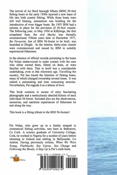 Researching the topic for Pat Nolan was a labour of love as it involved chatting with men who fished on those iconic vessels of another era. Previously, in 'Sea Change' Pat had written on the BIM 50-footer and its impact on coastal Ireland of the 1950s and '60s. The story of the BIM 56-footers naturally followed on from this. The book contains details on each boat, and recollections of individuals who owned and/or fished on them. Part I is based on comments, observations, experiences and memories relevant to the 56-footers. Part II is made up of individually traced histories of all thirty-nine BIM 56-footers built. Part III is made up of interesting lifetime maritime experiences of men Pat met on the way.