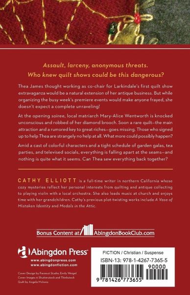 Thea James has accepted an assignment as co-chairperson for Larkindale's first quilt show extravaganza. Juggling the new assignment with running her antique business, she's already feeling frayed when things start to unravel. Mary-Alice Wentworth, a much-loved town matriarch, respected quilt judge, and Thea's dear friend, is covertly conked on the head during the kick-off Quilt Show Soiree, throwing suspicion on her guests. It also appears that a valuable diamond brooch has been stolen during the attack. The family is furious. But is it because of their mugged mother or the missing diamonds? When a renowned textile expert goes MIA and the famous Wentworth heritage quilt disappears, Larkindale's reputation as a tourist haven is at risk. Thea attempts to piece the mystery together and save the town's investment in the quilt show before Mary-Alice is attacked again . . . with far worse results.
