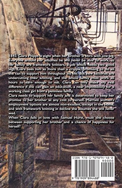 1845: Clara Phipps is eight when her brother is born with one leg. Everyone around her assumes he will never be able to work, as her family are framework knitters, a job which needs two good legs. Clara sees him as more than a cripple, promising to do all she can to support him throughout his life. But new factories are undercutting their knitting, and the whole family must work all hours to earn enough to eat. Clara can only make any real difference if she can gain an education, a near impossibility for a working class girl from a penniless family. Clara needs to support her family and is determined to keep her promise to her brother at any cost to herself. Married women's employment options are almost non-existent, except in the home, and with framework knitting in decline she assumes she will never wed. When Clara falls in love with Samuel Hurst, must she choose between supporting her brother and a chance of happiness for herself?