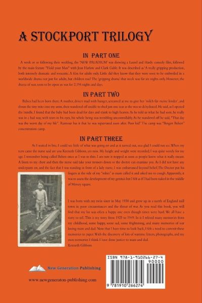 In Part One A week or so following their wedding, the 'New Paladium' was showing a Laurel and Hardy comedy film, followed by the main feature "Hold your Man" with Jean Harlow and Clark Gable. It was described as 'A really gripping production, both intensely dramatic and romantic. A film for adults only. Little did they know that they were soon to be embroiled in a worldwide drama not just for adults, but children too? The 'gripping drama' that week was for six nights only. However, the drama of war, soon to be upon us was for 2,194 nights and days. In Part Two Babies had been born there. A mother, driven mad with hunger, screamed at me to give her 'milch fur meine kinder', and thrust the tiny mite into my arms, then wandered off unable to shed just one tear as she was so dehydrated. He said, as I opened the bundle, I found that the baby had been dead for days and stunk to high heaven. As he told us what he had seen, he really was in a bad way, with tears in his eyes, his whole being was trembling uncontrollably. As he wandered off he said, "That day was the worst day of my life". Rumour has it that he was repatriated soon after. Poor kid. The camp was "Bergen Belsen" concentration camp. In Part Three As I waited in line, I could see little of what was going on and as it turned out, was glad I could not see. When my turn came the nurse said are you Kenneth Gibbons, yes miss. My height and weight were recorded; I was quite weedy for my age. I remember being called Belsen once as I was so thin. I am sure it stopped as soon as people knew what it really meant. A listen to my chest and then the nurse said take your trousers down so the doctor can examine you. As I did not have any underpants on, and the fact that I was standing in front of a lady nurse, I was embarrassed beyond belief; The Doctor put his fingers at the side of my "robin" as mam called it and asked me to cough. Apparently, it was to assess the development of my genitals but I felt as if I had been naked in the middle of Mersey square. I was born with my twin sister in May 1938 and grew up in a north of England mill town in poor circumstances and the threat of war. As you read this book, you will find that my lot was often a happy one even though times were hard. We all have a story to tell. This is my story from 1925 to 1949. In it I relived many memories from my childhood, some happy, some sad, some frightening, and many memories of our loving mam and dad. Now that I have time to look back, I felt a need to commit these memories to paper. With the discovery of lots of wartime letters, photographs, and my own memories I think I have done justice to mam and dad. Kenneth Gibbons