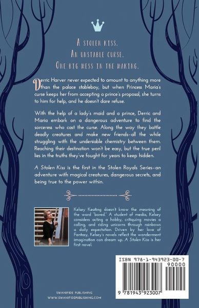 A stolen kiss. An unstable curse. One big mess in the making. Derric Harver never expected to amount to anything more than the palace stableboy, but when Princess Maria's curse keeps her from accepting a prince's proposal, she turns to him for help, and he doesn't dare refuse. With the help of a lady's maid and a prince, Derric and Maria embark on a dangerous adventure to find the sorceress who cast the curse. Along the way they battle deadly creatures and make new friends--all the while struggling with the undeniable chemistry between them. Reaching their destination won't be easy, but the true peril lies in the truths they've fought for years to keep hidden. A Stolen Kiss is the first in the Stolen Royals Series--an adventure with magical creatures, dangerous secrets, and being true to the power within.