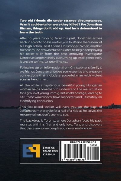 Two old friends die under strange circumstances. Was it accidental or were they killed? For Jonathan Birnam, things don't add up. And he is determined to learn the truth. After 10 years running from his past, Jonathan rides his motorcycle back to Toronto to attend the funeral of his high school best friend Christopher. When another friend is found drowned two weeks later, he begins employing his police skills from the past, annoying investigator Detective Kelly but turning up intelligence Kelly is unable to find. Following up on information from Christopher's family and friends, Jonathan uncovers some strange and unsavory connections that include drug dealers and a powerful man with violent henchmen. A mysterious, beautiful young Hungarian woman helps Jonathan to understand the real situation for a group of young immigrants held hostage, leading to a truth he would never have suspected and ultimately, an electrifying conclusion. This fast-paced thriller will have you on the back of Jonathan's motorcycle for a hell of a ride as he solves the mystery others don't seem to see. The backdrop is Toronto, where Jonathan faces his past, reunites with his first and only love, Tara, and discovers that there are some people you never really know. About the Author: Kinmond Smith is the author of a number of short stories, two plays and now, his debut novel. Armed with a degree in English Literature and Drama from the University of Toronto, he had little choice but to become a teacher. Kinmond is the Program Coordinator for Graphic Design Program at Seneca College. He makes his home in the Beach, Toronto.