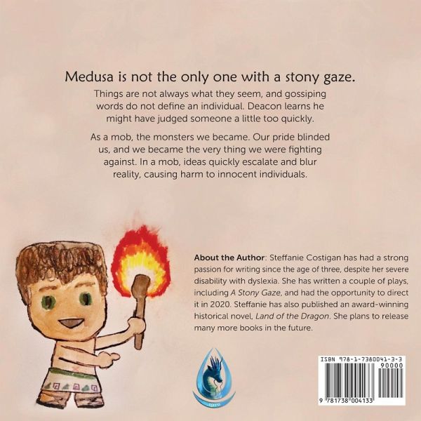 Medusa is not the only one with a stony gaze. Things are not always what they seem and gossiping words do not define an individual. Deacon learns that perhaps he judged someone a little too quickly. "Within the mob the monsters we became. Pride blinded us and we became the very thing we thought we were fighting against. Ideas quickly escalate within a mob and reality becomes blurred hurting innocent individuals." The Greek mythology of Medusa with a fun learning twist to it. A Stony Gaze helps kids to learn in a safe environment about group polarization, mob mentality, gossip, bullying and the harm it can do to others. This story encourages kids to communicate and think as an individual before making harmful judgments, in a safe environment. A read that promotes anti-bullying and shares strategies to help kids understand there is two sides to each story.