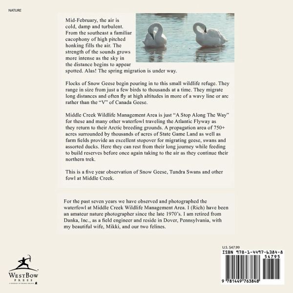 Mid-February, the air is cold, damp and turbulent. From the southeast a familiar cacophony of high pitched honking fills the air. The strength of the sounds grows more intense as the sky in the distance begins to appear spotted. Alas! The spring migration is under way. Flocks of Snow Geese begin pouring in to this small wildlife refuge. They range in size from just a few birds to thousands at a time. They migrate long distances and often fly at high altitudes in more of a wavy line or arc rather than the "V" of Canada Geese. Middle Creek Wildlife Management Area is just "A Stop Along The Way" for these and many other waterfowl traveling the Atlantic Flyway as they return to their Arctic breeding grounds. A propagation area of 750+ acres surrounded by thousands of acres of State Game Land as well as farm fields provide an excellent stopover for migrating geese, swans and assorted ducks. Here they can rest from their long journey while feeding to build reserves before once again taking to the air as they continue their northern trek. This is a five year observation of Snow Geese, Tundra Swans and other fowl at Middle Creek.