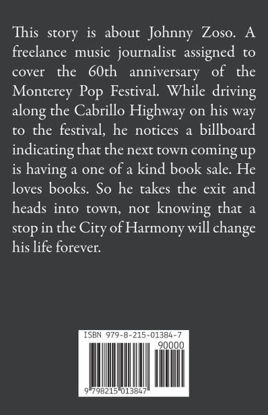 This story is about Johnny Zoso. A freelance music journalist assigned to cover the 60th anniversary of the Monterey Pop Festival. While driving along the Cabrillo Highway on his way to the festival, he notices a billboard indicating that the next town coming up is having a one of a kind book sale. He loves books. So he takes the exit and heads into town, not knowing that a stop in the City of Harmony will change his life forever.