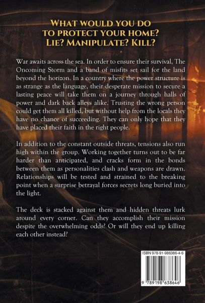 What would you do to protect your home? Lie? Manipulate? Kill? War awaits across the sea. In order to ensure their survival, the Oncoming Storm and a band of misfits set sail for the land beyond the horizon. In a country where the power structure is as strange as the language, their desperate mission to secure a lasting peace will take them on a journey through halls of power and dark back alleys alike. Trusting the wrong person could get them all killed, but without help from the locals they have no chance of succeeding. They can only hope that they have placed their faith in the right people. In addition to the constant outside threats, tensions also run high within the group. Working together turns out to be far harder than anticipated, and cracks form in the bonds between them as personalities clash and weapons are drawn. Relationships will be tested and strained to the breaking point when a surprise betrayal forces secrets long buried into the light. The deck is stacked against them and hidden threats lurk around every corner. Can they accomplish their mission despite the overwhelming odds? Or will they end up killing each other instead?