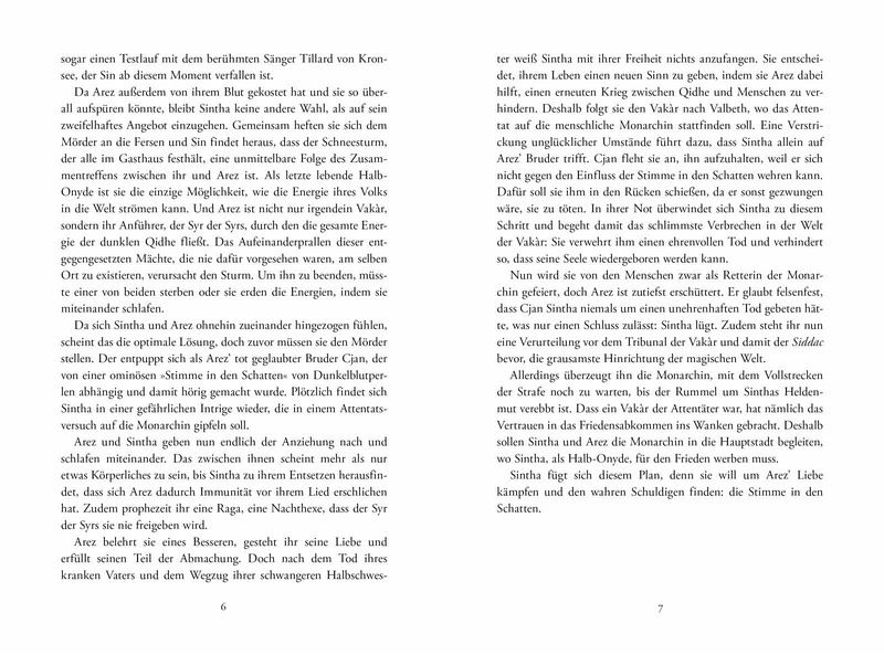 Sintha konnte die mysteriöse Mordserie in Enebha zwar beenden, doch der Preis dafür war hoch: Jeder weiß nun, wer sie ist. Darum muss sie an der Seite der Monarchin in die Hauptstadt reisen, wo sie als Symbol des Friedens vorgeführt werden soll. Doch das scheinbare Wohlwollen der Monarchin hat ein Ablaufdatum und Arez' Misstrauen verfolgt sie ebenso wie der Sturm. Wenn es ihr nicht gelingt, den Drahtzieher hinter der gefährlichen Intrige zu finden, in die sie verstrickt wurde, verliert sie nicht nur seine Liebe, sondern auch ihr Leben.