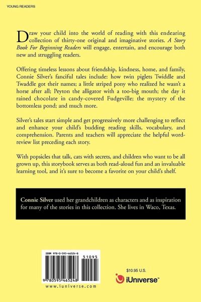 Draw your child into the world of reading with this endearing collection of thirty-one original and imaginative stories. A Story Book For Beginning Readers will engage, entertain, and encourage both new and struggling readers. Offering timeless lessons about friendship, kindness, home, and family, Connie Silver's fanciful tales include: how twin piglets Twiddle and Twaddle got their names; a little striped pony who realized he wasn't a horse after all; Peyton the alligator with a too-big mouth; the day it rained chocolate in candy-covered Fudgeville; the mystery of the bottomless pond; and much more. Silver's tales start simple and get progressively more challenging to reflect and enhance your child's budding reading skills, vocabulary, and comprehension. Parents and teachers will appreciate the helpful word-review list preceding each story. With popsicles that talk, cats with secrets, and children who want to be all grown up, this storybook serves as both read-aloud fun and an invaluable learning tool, and it's sure to become a favorite on your child's shelf.