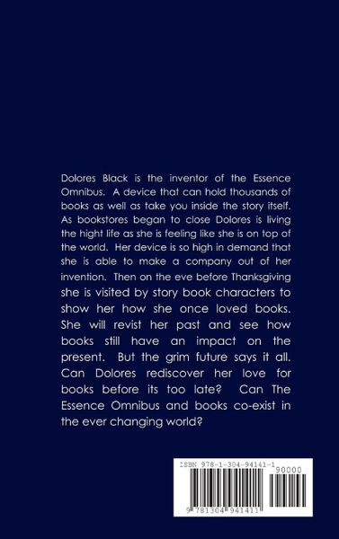 Dolores Black is the inventor of The Essence Omnibus. A device that can hold thousands of books as well as take you into the story itself. As book stores are closing Dolores is living the high life. Her invention is in high demand that she is able to make a company out of it. Then on the eve before Thanksgiving she is visited by story book characters. She must see how she her past as she once loved books. She will see how books still have an impact in the present. She will also see the grim future. Can she rediscover herself before it's too late? Can the Essence Omnibus and books co-exist?