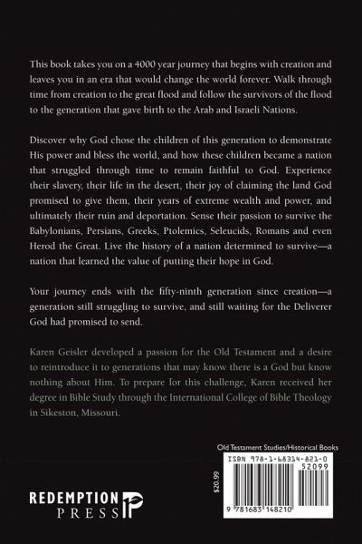 This book takes you on a 4000 year journey that begins with creation and leaves you in an era that would change the world forever. Walk through time from creation to the great flood and follow the survivors of the flood to the generation that gave birth to the Arab and Israeli Nations. Discover why God chose the children of this generation to demonstrate His power and bless the world, and how these children became a nation that struggled through time to remain faithful to God. Experience their slavery, their life in the desert, their joy of claiming the land God promised to give them, their years of extreme wealth and power, and ultimately their ruin and deportation. Sense their passion to survive the Babylonians, Persians, Greeks, Ptolemics, Seleucids, Romans and even Herod the Great. Live the history of a nation determined to survive--a nation that learned the value of putting their hope in God.