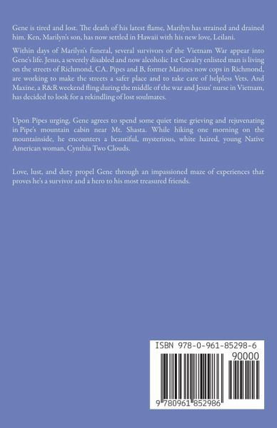 Gene is tired and lost. The death of his latest flame, Marilyn has strained and drained him. Ken, Marilyn's son, has now settled in Hawaii with his new love, Leilani. Within days of Marilyn's funeral, several survivors of the Vietnam War appear into Gene's life. Jesus, a severely disabled and now alcoholic 1st Cavalry enlisted man is living on the streets of Richmond, CA. Pipes and B, former Marines now cops in Richmond, are working to make the streets a safer place and to take care of helpless Vets. And Maxine, a R&R weekend fling during the middle of the war and Jesus' nurse in Vietnam, has decided to look for a rekindling of lost soulmates. Upon Pipes urging, Gene agrees to spend some quiet time grieving and rejuvenating in Pipe's mountain cabin near Mt. Shasta. While hiking one morning on the mountainside, he encounters a beautiful, mysterious, white haired, young Native American woman, Cynthia Two Clouds. Love, lust, and duty propel Gene through an impassioned maze of experiences that proves he's a survivor and a hero to his most treasured friends.