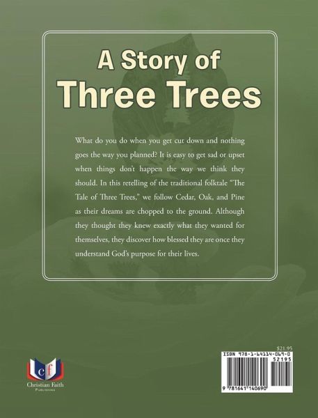 What do you do when you get cut down and nothing goes the way you planned? It is easy to get sad or upset when things don't happen the way we think they should. In this retelling of the traditional folktale "The Tale of Three Trees," we follow Cedar, Oak, and Pine as their dreams are chopped to the ground. Although they thought they knew exactly what they wanted for themselves, they discover how blessed they are once they understand God's purpose for their lives.