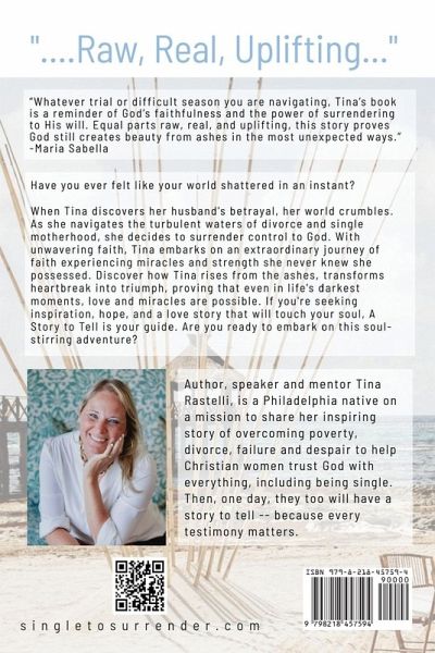 Have you ever felt like your world shattered in an instant? When Tina discovers her husband's betrayal, her world crumbles and plunges her into a dark abyss of despair. But in the depths of her pain, a flicker of hope ignites. As she navigates the turbulent waters of divorce and single motherhood, she decides to surrender control to God. Who knew that would be the key to unlocking a life beyond her wildest dreams? With unwavering faith, Tina embarks on an extraordinary journey of faith experiencing miracles and strength she never knew she possessed. As she rebuilds her life, Tina finds joy, peace and love. But it was from her pain that she found her purpose. A Story to Tell is a testament to the power of resilience, the beauty of surrender, and the unwavering love of a Heavenly Father. Discover how Tina rises from the ashes, transforms heartbreak into triumph, proving that even in life's darkest moments, love and miracles are possible. If you're seeking inspiration, hope, and a love story that will touch your soul, A Story to Tell is your guide. Are you ready to embark on this soul-stirring adventure?