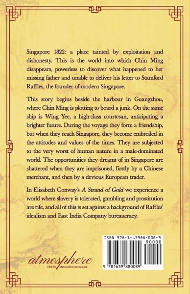 Singapore 1822: a place tainted by exploitation and dishonesty. This is the world into which Chin Ming disappears, powerless to discover what happened to her missing father and unable to deliver his letter to Stamford Raffles, the founder of modern Singapore. This story begins beside the harbour in Guangzhou, where Chin Ming is plotting to board a junk. On the same ship is Wing Yee, a high-class courtesan, anticipating a brighter future. During the voyage they form a friendship, but when they reach Singapore, they become embroiled in the attitudes and values of the times. They are subjected to the very worst of human nature in a male-dominated world. The opportunities they dreamt of in Singapore are shattered when they are imprisoned, firstly by a Chinese merchant, and then by a devious European trader. In Elisabeth Conway's A Strand of Gold we experience a world where slavery is tolerated, gambling and prostitution are rife, and all of this is set against a background of Raffles' idealism and East India Company bureaucracy.