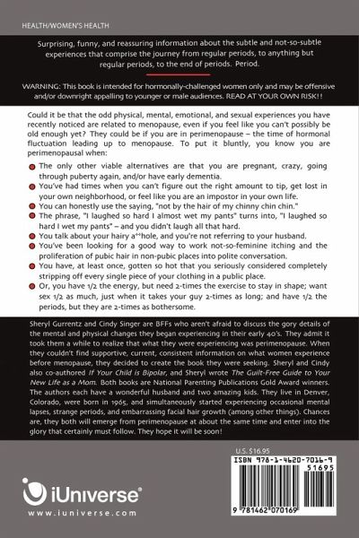 Have you recently found that you can't figure out what the tip should be on a bill or remember how to get on the freeway? Is it possible you aren't imagining that there is roughly a millisecond between the time when you realize you need to go to the bathroom and when you've already started to go? It could be that these strange symptoms happening to your mind, body, soul, and sex life are related to menopause, even if you aren't even fifty yet. You could be in perimenopause-the time of hormonal fluctuation leading up to menopause. To put it bluntly, you know you are perimenopausal when ¿ the phrase, "I laughed so hard I almost wet my pants," turns into, "I laughed so hard I did wet my pants,"-and you didn't laugh all that hard; ¿ you have the right to use the saying, "not by the hair of my chinny chin chin"; ¿ you have, at least once, gotten so hot that you seriously considered completely stripping off every single piece of your clothing in a public place. In A Strange Period, authors Cindy Singer and Sheryl Gurrentz share their own experiences as well as anecdotes told by women at the "Hormonal Happy Hours" they hosted. They aren't afraid to discuss the gory details of the mental and physical changes they both experienced in their early forties.