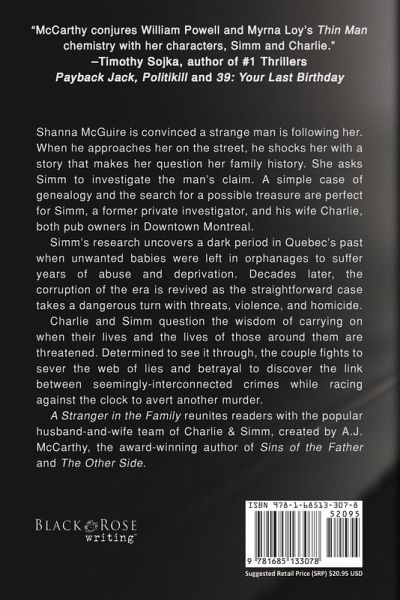 From International Bestselling author, A.J. McCarthy, comes a new Charlie & Simm Mystery. Shanna McGuire is convinced a strange man is following her. When he approaches her on the street, he shocks her with a story that makes her question her family history. She asks Simm to investigate the man's claim. A simple case of genealogy and the search for a possible treasure are perfect for Simm, a former private investigator, and his wife Charlie, both pub owners in Downtown Montreal. Simm's research uncovers a dark period in Quebec's past when unwanted babies were left in orphanages to suffer years of abuse and deprivation. Decades later, the corruption of the era is revived as the straightforward case takes a dangerous turn with threats, violence, and homicide. Charlie and Simm question the wisdom of carrying on when their lives and the lives of those around them are threatened. Determined to see it through, the couple fights to sever the web of lies and betrayal to discover the link between seemingly-interconnected crimes while racing against the clock to avert another murder. A Stranger in the Family reunites readers with the popular husband-and-wife team of Charlie & Simm, created by A.J. McCarthy, the award-winning author of Sins of the Father and The Other Side.