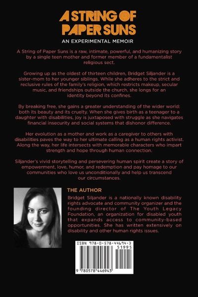 A String of Paper Suns is a raw, intimate, powerful, and humanizing story by a single teen mother and former member of a fundamentalist religious sect. Growing up as the oldest of thirteen children, Bridget Siljander is a sister-mom to her younger siblings. While she adheres to the strict and reclusive rules of the family's religion, which restricts makeup, secular music, and friendships outside the church, she longs for an identity beyond its confines. By breaking free, she gains a greater understanding of the wider world: both its beauty and its cruelty. When she gives birth as a teenager to a daughter with disabilities, joy is juxtaposed with struggle as she navigates financial insecurity and social systems that dishonor difference. Her evolution as a mother and work as a caregiver to others with disabilities paves the way to her ultimate calling as a human rights activist. Along the way, her life intersects with memorable characters who impart strength and hope through human connection. Siljander's vivid storytelling and persevering human spirit create a story of empowerment, love, humor, and redemption and pay homage to our communities who love us unconditionally and help us transcend our circumstances.