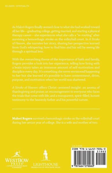After surviving a stroke while playing college volleyball, author Malori Rogers learned how to find God and his will by seeing life through a spiritual lens. With the overarching theme of the importance of faith and family, Rogers provides a look into her experience and how living with a brain injury takes an immense amount of motivation and discipline every day. It's not something Rogers ever envisioned experiencing, but she has learned it's possible to have contentment, drive, purpose, and motivation even when our world is shattered. A Stroke of Heaven offers encouragement to everyone who faces the trials that come with life and a transparent, spirit-filled, honest testimony to the heavenly father and his powerful nature.