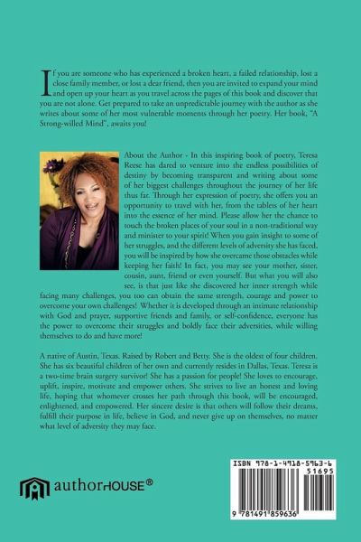 If you are someone who has experienced a broken heart, a failed relationship, lost a close family member, or lost a dear friend, then you are invited to expand your mind and open up your heart as you travel across the pages of this book and discover that you are not alone. Get prepared to take an unpredictable journey with the author as she writes about some of her most vulnerable moments through her poetry. Her book, "A Strong-willed Mind", awaits you!