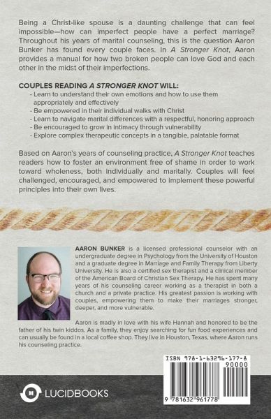 Being a Christ-like spouse is a daunting challenge that can feel impossible—how can imperfect people have a healthy marriage? Throughout his years of marital counseling, this is the question Aaron Bunker has found every couple faces. In A Stronger Knot, Aaron provides a manual for how two broken people can love God and each other in the midst of their imperfections. Couples reading A Stronger Knot will: Learn to understand their own emotions and how to use them appropriately and effectively Be empowered in their individual walks with Christ Learn to navigate marital differences with a respectful, honoring approach Be encouraged to grow in intimacy through vulnerability Explore complex therapeutic concepts in a tangible, palatable format Based on Aaron’s years of counseling practice, A Stronger Knot teaches readers how to foster an environment free of shame in order to work toward wholeness, both individually and maritally. Couples will feel challenged, encouraged, and empowered to implement these powerful principles into their own lives.