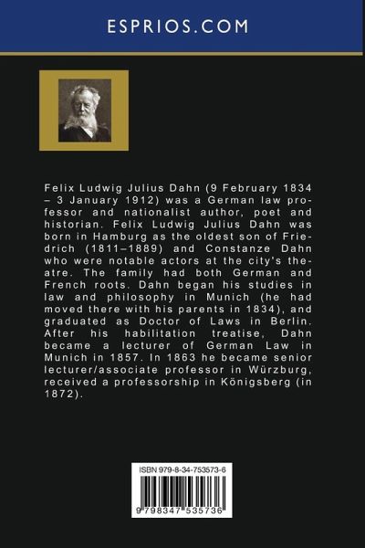 Felix Ludwig Julius Dahn (9 February 1834 - 3 January 1912) was a German law professor and nationalist author, poet and historian. Felix Ludwig Julius Dahn was born in Hamburg as the oldest son of Friedrich (1811-1889) and Constanze Dahn who were notable actors at the city's theatre. The family had both German and French roots. Dahn began his studies in law and philosophy in Munich (he had moved there with his parents in 1834), and graduated as Doctor of Laws in Berlin. After his habilitation treatise, Dahn became a lecturer of German Law in Munich in 1857. In 1863 he became senior lecturer/associate professor in Würzburg, received a professorship in Königsberg (in 1872).