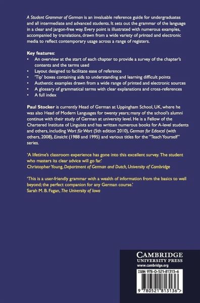 A Student Grammar of German is an invaluable reference guide for undergraduates and other intermediate and advanced students. Written with the needs of the learner very much in mind, it sets out the grammar of the language in a clear and jargon-free way. Each chapter starts with an overview of the main grammatical terminology and concepts; these terms are also cross-referenced in the glossary at the end of the book. To provide a visual guide through each chapter, the main points in each section are highlighted, and tables summarise important patterns. 'Tip' boxes, which help the student to master particular points, are scattered through the text. Every point has numerous illustrative examples, each with its translation, carefully chosen from a wide range of printed and electronic media - books, newspapers, magazines, film and chat-rooms - to reflect contemporary usage across a range of registers.