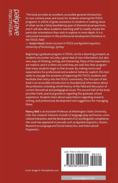 Beginning a graduate program in TESOL can be a daunting prospect, as students encounter not only a great deal of new information, but also new ways of thinking, writing, and interacting. Many of the expectations are implicit, and it is often not until they are well into their program that many students begin to feel at ease. By making norms and expectations for professional and academic behavior explicit, this text seeks to assuage the anxieties of beginning MA TESOL students and facilitate their entry into the TESOL community. The first part of the book is an accessible introduction to foundational information about the profession, including a brief history of the field and discussion of current theoretical and pedagogical issues. The second half of the book provides frank, practical guidance regarding the graduate school experience. Students learn about expectations regarding research, writing, and professional development and suggestions for managing these. This text provides new or prospective MA TESOL students with an accessible introduction to the field and to the graduate school experience