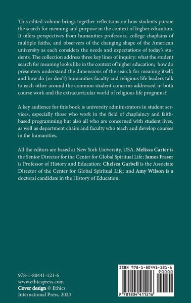 This edited volume brings together reflections on how students pursue the search for meaning and purpose in the context of higher education. It offers perspectives from humanities professors, college chaplains of multiple faiths, and observers of the changing shape of the American university as each considers the needs and expectations of today's students. The collection address three key lines of inquiry: what the student search for meaning looks like in the context of higher education; how do presenters understand the dimensions of the search for meaning itself; and how do (or don't) humanities faculty and religious life leaders talk to each other around the common student concerns addressed in both course work and the extracurricular world of religious life programs? Together, the conversation suggests that students pursue a search for meaning in the context of university life and the academic curriculum, but the particular dimensions of this search are yet undefined. This is often a contested pursuit because it conflicts with the other purposes of the university which some see as primary. A key audience for this book is university administrators who work in the field of chaplaincy and faith-based programming, as well as department chairs and faculty in the liberal arts who are directly involved in building humanities curriculum.