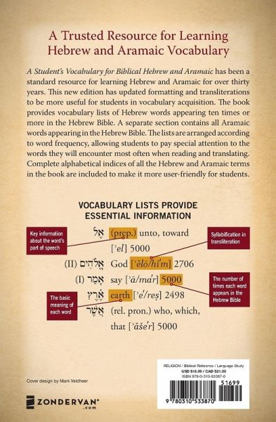 A Studentâ s Vocabulary for Biblical Hebrew and Aramaic, Updated Edition has been a standard resource for students of Hebrew and Aramaic for over 30 years, this new edition has updated formatting and transliterations. The book provides vocabulary lists of Hebrew and Aramaic words based on frequency.