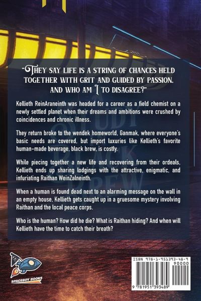 "They say life is a string of chances held together with grit and guided by passion, and who am I to disagree?" Kellieth ReinAraneinth was headed for a career as a field chemist on a newly settled planet when their dreams and ambitions were crushed by coincidences and chronic illness. They return broke to the wendek homeworld, Ganmak, where everyone's basic needs are covered, but import luxuries like Kellieth's favorite human-made beverage, black brew, is costly. While piecing together a new life and recovering from their ordeals, Kellieth ends up sharing lodgings with the attractive, enigmatic, and infuriating Raithan WeinZalneinth. When a human is found dead next to an alarming message on the wall in an empty house, Kellieth gets caught up in a gruesome mystery involving Raithan and the local peace corps. Who is the human? How did he die? What is Raithan hiding? And when will Kellieth have the time to catch their breath? Praise for A Study in Black Brew: "Who doesn't love a good Sherlock Holmes retelling? Now make it diverse, with wonderful lovable characters, an alien world, a dash of humour, and a lot of cosy vibes. And did I mention the space elves? Definitely not just for fans of the infamous detective duo, but everyone who enjoys cosy sci-fi and mysteries." - Iris Retzlaff, author of Moon's Lament "A Study in Black Brew is a Sherlockian mystery with a fresh sci-fi slant that enlivens a classic while paying homage to spirit of the original. A must read for fans of Conan Doyle who yearn for a modern twist." - Kara Jorgenson, author of The Reanimator's Heart "A Study in Black Brew is a story that lingers. It's full of Marie's signature wit and banter, presenting a layered plot that's pushed forward by a charming cast of characters." - Nathaniel Luscombe, author of Moon Soul "Writing a great retelling is the art of presenting the expected, and often sentimental, in a fresh and exciting way. In A Study in Black Brew, Marie does this with flair and heart. While the story is recognizably based on Sir Arthur Conan Doyle's A Study in Scarlet, everything is shifted to unveil an alien world of excitement and danger, while making ample room for cozier moments and lovable characters. There is nothing elementary about this charming detective story. Well done Marie!" - J. Cornelius, author of Remembering Demons and Catching Spiders "A futuristic take on a classic detective that's as fresh as the brew. And if you're someone with an invisible disability, be prepared to be visible like never before. And I never had the same fangirl attraction to Sherlock and Watson in popular remakes. But reading this? I get it." - Aden Ng, author of The Chronicles of Tearha "Marie Howalt does queer and neurodivergent justice to Sherlock Holmes' legacy in the latest novel, A Study in Black Brew. Highly entertaining, clever, with a true dose of mystery and deep empathy, A Study in Black Brew will satisfy any reader who enjoys puzzle mysteries and a modern reflection on the true personal cost of handicap and neurodiversity. Totally recommended." - Seb Doubinsky, author of The Sum Of All Things "A Study in Black Brew is a vibrant Sherlock Holmes retelling with some great characters in an interesting world. I enjoyed the chemistry between the alien cast and trying to remember or guess where the story was going." - K. P. Kilbride, author of Spaceships Passing in the Night