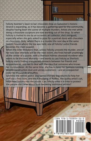 Felicity Koerber's bean to bar chocolate shop on Galveston's historic Strand is expanding, as it has become a gathering spot for the community, despite having been the scene of multiple murders. Artists she met while doing a chocolate sculpture are now working out of the shop. So when Felicity is invited to tea by an eccentric art collector, she's intrigued, especially when she gets asked to pose for a portrait done with chocolate on chocolate. Only, where there is a murder the next day at the same historic house where the tea was held, one of Felicity's artist friends becomes the main suspect. When the killer threatens that, unless Felicity unravels the murder, one of her two love interests will be the next victim, she finds herself unwittingly at the center of a puzzle, with a Sherlock Holmes obsessed murderer who wants to be the next Moriarty - and wants to cast Felicity as Sherlock. Felicity starts finding unexpected connects between her friends and acquaintances, and has to deal with the idea that someone who knows her is a murderer. At the same time, she has to keep her business running, despite construction dust and unruly customers - and an unexpected order for thousands of truffles. Satchmo the retired police dog turned therapy dog returns to help her sniff out a few clues, and the kidnapping of Ruffles, the quirky artist's cat, helps lead Felicity into the puzzle. Can Felicity solve it in time to protect the people she cares about from becoming additional victims?