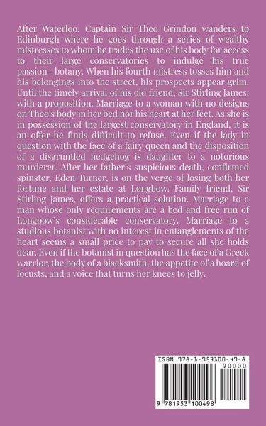 After Waterloo, Captain Sir Theo Grindon wanders to Edinburgh where he goes through a series of wealthy mistresses to whom he trades the use of his body for access to their large conservatories to indulge his true passion-botany. When his fourth mistress tosses him and his belongings into the street, his prospects appear grim. Until the timely arrival of his old friend, Sir Stirling James, with a proposition. Marriage to a woman with no designs on Theo's body in her bed nor his heart at her feet. As she is in possession of the largest conservatory in England, it is an offer he finds difficult to refuse. Even if the lady in question with the face of a fairy queen and the disposition of a disgruntled hedgehog is daughter to a notorious murderer. After her father's suspicious death, confirmed spinster, Eden Turner, is on the verge of losing both her fortune and her estate at Longbow. Family friend, Sir Stirling James, offers a practical solution. Marriage to a man whose only requirements are a bed and free run of Longbow's considerable conservatory. Marriage to a studious botanist with no interest in entanglements of the heart seems a small price to pay to secure all she holds dear. Even if the botanist in question has the face of a Greek warrior, the body of a blacksmith, the appetite of a hoard of locusts, and a voice that turns her knees to jelly.