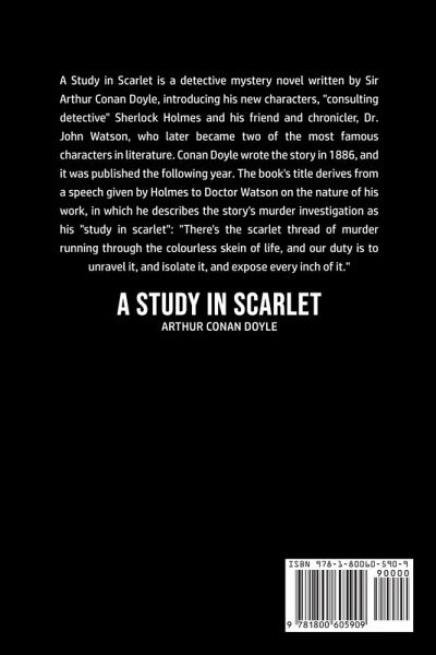 ¿Do you want to read A Study in Scarlet? If so then keep reading... A Study in Scarlet is a detective mystery novel written by Sir Arthur Conan Doyle, introducing his new characters, "consulting detective" Sherlock Holmes and his friend and chronicler, Dr. John Watson, who later became two of the most famous characters in literature. Conan Doyle wrote the story in 1886, and it was published the following year. The book's title derives from a speech given by Holmes to Doctor Watson on the nature of his work, in which he describes the story's murder investigation as his "study in scarlet": "There's the scarlet thread of murder running through the colourless skein of life, and our duty is to unravel it, and isolate it, and expose every inch of it." What are you waiting for A Study in Scarlet is one click away, select the "Buy Now" button in the top right corner NOW!