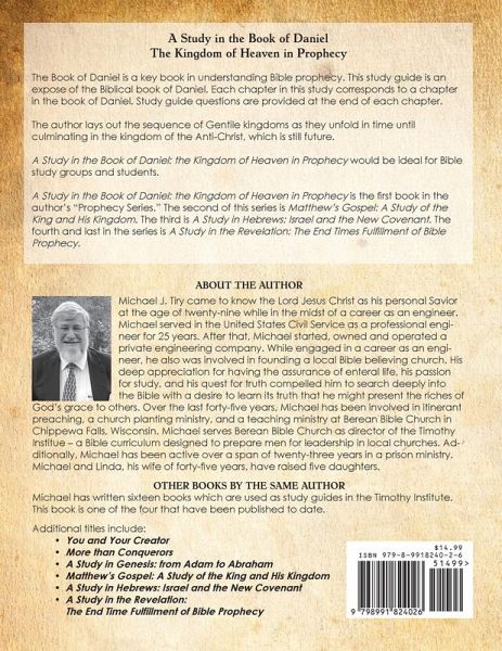 The Book of Daniel is a key book in understanding Bible prophecy. Prophecy centers in the nation of Israel and the role that the nation will play in God's plan for the earth. At the writing of the book of Daniel, the nation is being taken into captivity for its sin and rebellion against God. God's purpose in the book of Daniel is to communicate to Israel and to the nations that He is using Israel's captivity to bring in the "Times of the Gentiles" (i.e. the rule of the Gentiles over Israel and the world) but only as a temporary situation. He is doing it for the chastening of the disobedient nation. That nation was called of God to be His nation on the earth. Through God's work in chastening of that favored nation, it will again one day be His nation. Israel will then be God's means of blessing the Gentile nations under the reign of their Messiah. Bible Prophecy focuses of essentially the entire Bible outside of the Pauline Epistles. The theme of prophecy is the kingdom reign of Israel's Messiah over the earth. This study "A Study in the Book of Daniel - the Kingdom of Heaven in Prophecy." in Daniel is the first book in the author's "Prophecy Series." The author has a series of four books in what is called the Prophecy Series. The second of this series is "Matthew's Gospel- Study of the King and His Kingdom." The third in the series is A Study in Hebrews - Israel and the New Covenant.. The fourth and last in the series is A Study in the Revelation-the End Times Fulfillment of Bible Prophecy. Each chapter in this Study in Daniel is keyed to the corresponding chapter in the Bible book of Daniel. Study guide question at the end of each chapter serve as a guide to the Bible student. The answers to the study questions are found in the chapter in sequential order. In answering the study questions, the student gains a working knowledge of the Bible Prophecy.