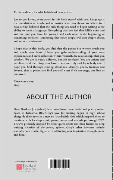 ""To the audience for which this book was written, Just so you know, every poem in this book started with you. Language is the foundation of words, and no matter what you choose to believe in, I have always believed that the only thing you need to begin writing is the ability to speak a language. Everything that you feel that fulfills your soul and the love you have for yourself and each other is the beginning of something excellent- something that other people will care deeply about, and want to understand. I hope that in this book, you find that the poems I've written reach you and touch your heart. I hope you gain understanding of your own experiences and crave reflection within yourself, the relationships that you conduct. We are so vastly different, but this we share: You are unique and excellent, and the things you have to say are truly said by nobody else. I hope you find through reading about my identity, youth, traumas and dreams, that in pieces you find yourself, even if it's one page, one line or one word. I love you always, Grey""