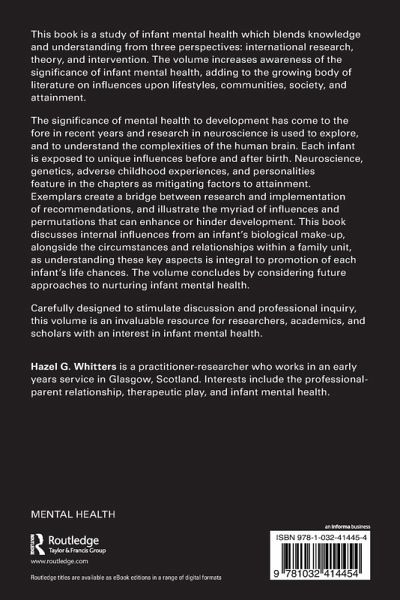 The significance of mental health to development has come to the fore in recent years and research in neuroscience is used to explore, and to understand the complexities of the human brain. Each infant is exposed to unique influences before and after birth. Neuroscience, genetics, adverse childhood experiences, and personalities feature in the chapters as mitigating factors to attainment. Exemplars create a bridge between research and implementation of recommendations, and illustrate the myriad of influences and permutations that can enhance or hinder development. This book discusses internal influences from an infant's biological make-up, alongside the circumstances and relationships within a family unit, as understanding these key aspects is integral to promotion of each infant's life chances. The volume concludes by considering future approaches to nurturing infant mental health.